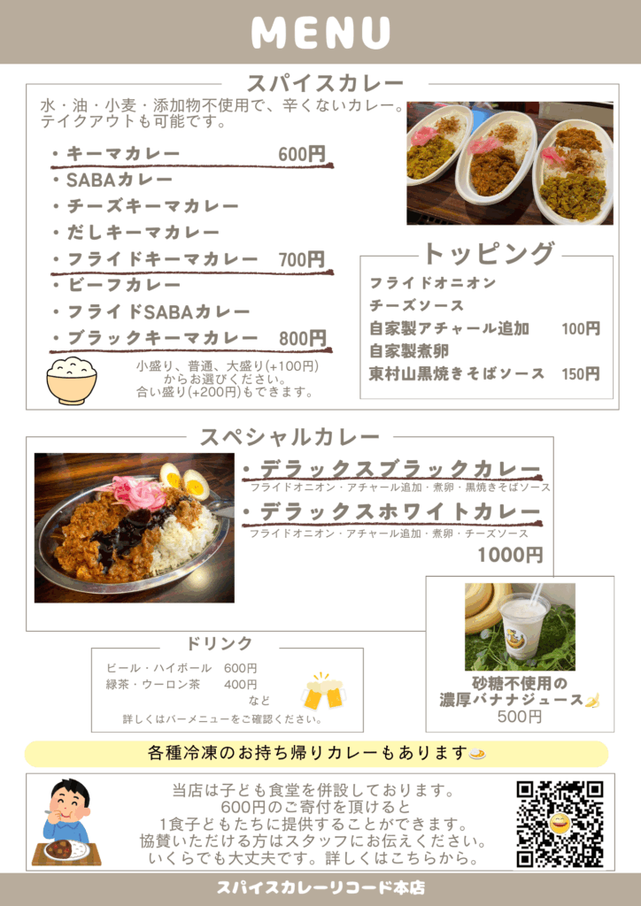 スパイスカレーリコードでは、いつでも子どもは無料でキーマカレーを食べられる子ども食堂を併設しています。